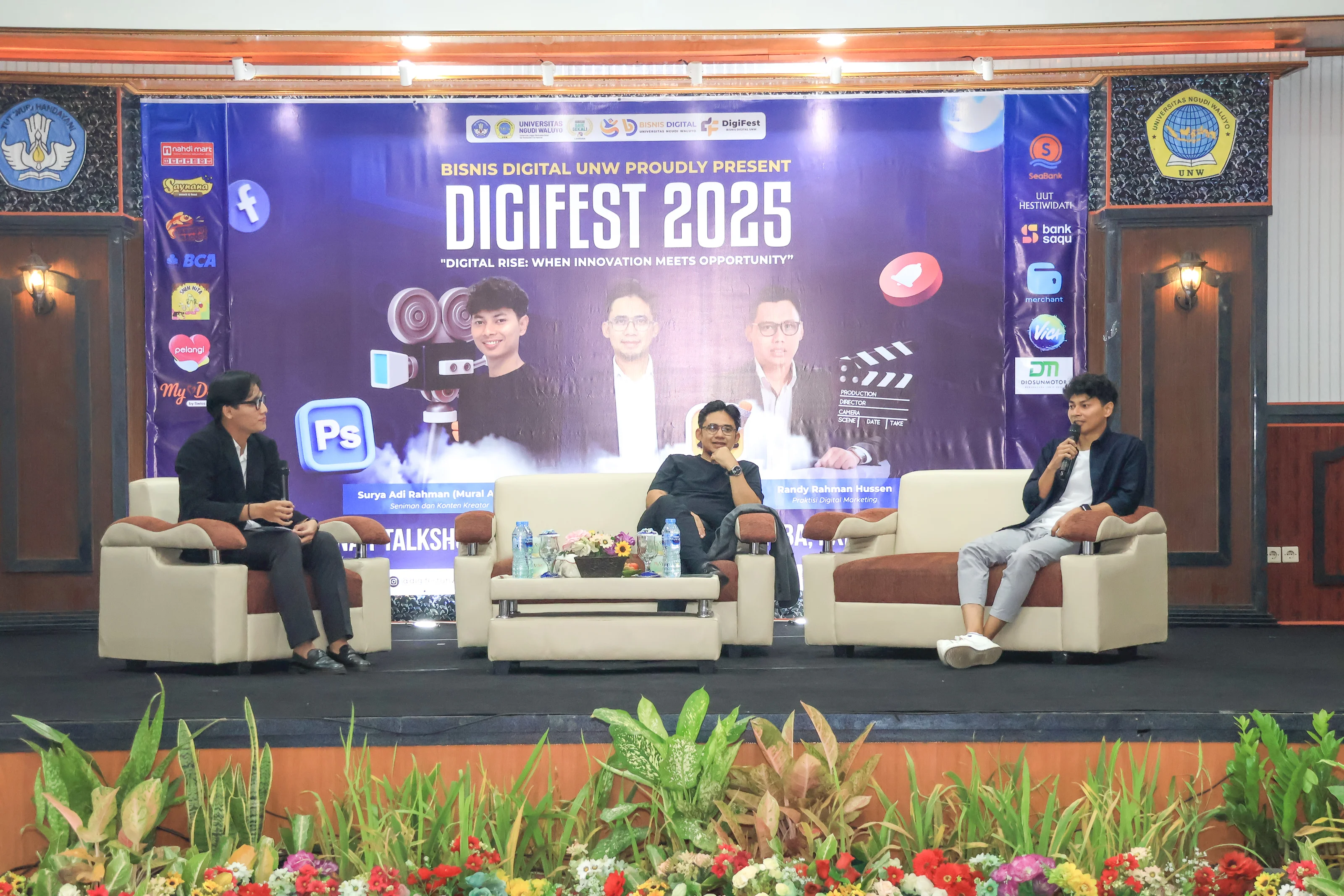 Dalam sambutan pembukaan, Dekan FEHH UNW Budiarti, S.Pd., M.Pd., menegaskan bahwa kebangkitan digital tidak dapat dipahami sebatas wacana teknologi semata. “Kebangkitan digital merupakan posisi strategis yang harus dimanfaatkan dengan cerdas. Digifest ini menjadi jembatan yang mempertemukan inovasi dengan peluang usaha dan bisnis di masa depan,” ujarnya. Ia menambahkan bahwa inovasi tidak selalu identik dengan menciptakan aplikasi yang canggih, melainkan bagaimana kita mampu menghadirkan nilai tambah dan membangun gaya bisnis baru yang adaptif terhadap perubahan. Melalui kegiatan ini, ia berharap akan tumbuh kolaborasi aktif yang mampu melahirkan inovasi bisnis digital yang relevan dan berkelanjutan.